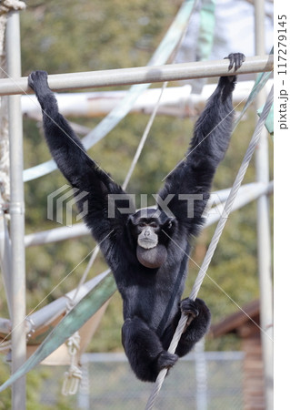 フクロテナガザル)あごの下にある大きな鳴き袋を膨らませる