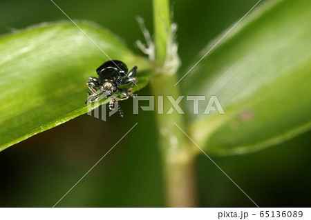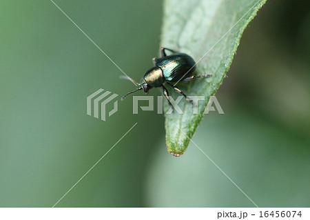 生き物 昆虫 オキナワイモサルハムシ、体色は変異がありこの個体はメタリックグリーン