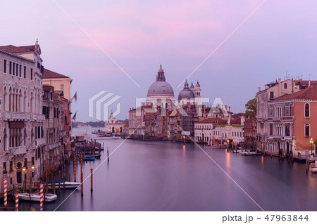 ヴェネチアの運河とサンタマリアデッラサルーテ聖堂と日の出