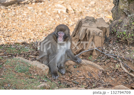 切り株の上にすわるニホンザル 嵐山モンキーパークいわたやま