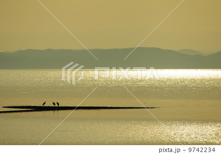 サロマ湖の夕暮れと白鳥のシルエット