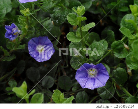 雨滴のついた青いコンボルブルス・サバティウスの花(ペイルブルーの丸葉朝顔)