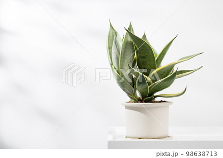 Sansevieria or snake plant in a white ceramic flowerpot on the light background, minimal modern interior with copy space