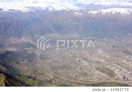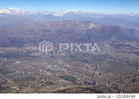 南米アンデス山脈の麓に広がるチリ共和国の首都サンチアゴの空撮
