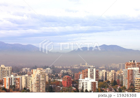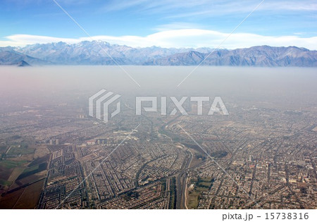 南米チリ共和国、冬場に発生する首都サンチアゴ市街のスモッグとアンデスの山並み