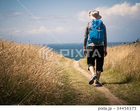Galapagos tourist walking on Santiago Island in Galapagos Islands