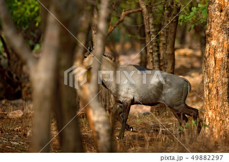 Beautiful male sambar (Rusa unicolor) deer walking in the forest of Ranthambore National Park, Rajasthan, India