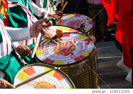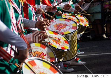 街中の通りでサンバを踊るブラジルの人たちの衣装