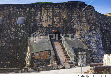 Puerto Rico, Old San Juan, section of El Morro Fortress under blue sky