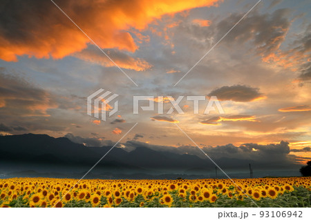 山梨県北杜市明野町浅尾 明野サンフラワーフェスの満開のひまわりと南アルプスの山並みと夕焼け空