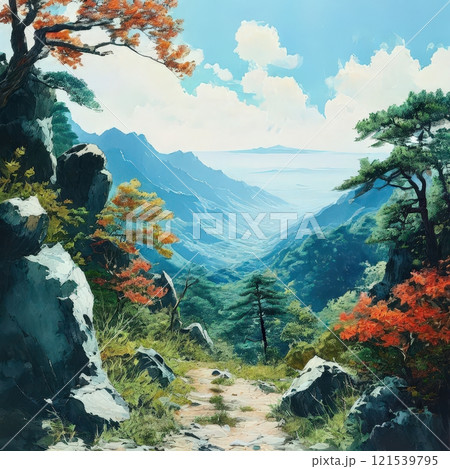 the AI Image Generator, Mountain Path with Colorful Trees in Bright Autumn Daylight
