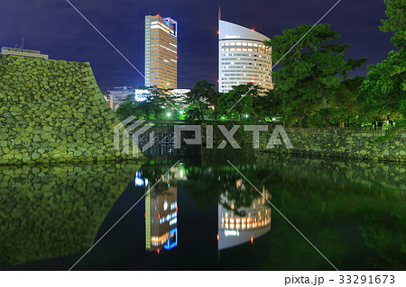 高松城跡の桜の馬場から見る天守台とサンポート高松のJRホテルクレメント高松