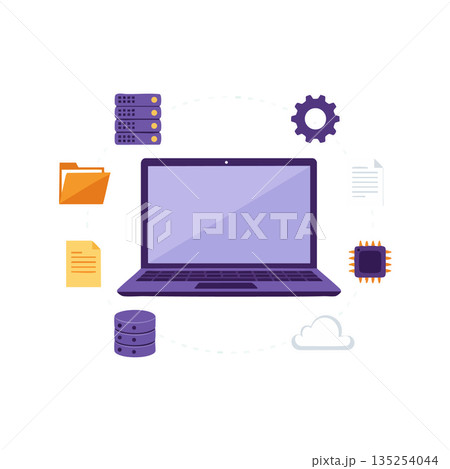 Laptop computer with cloud storage and data server icons for digital technology and computing concepts vector illustration