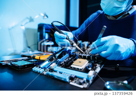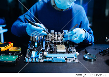 Engineer in gloves repairing a computer motherboard with digital AR icons. Technology, repair, circuit, and innovation concept