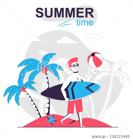 Summertime activity isolated cartoon concept. Man surfer resting on beach on vacation, people scene in flat design. Vector illustration for blogging, website, mobile app, promotional materials.