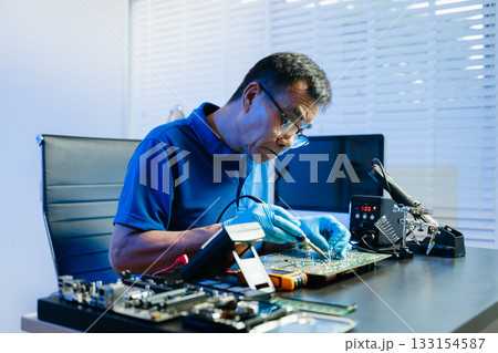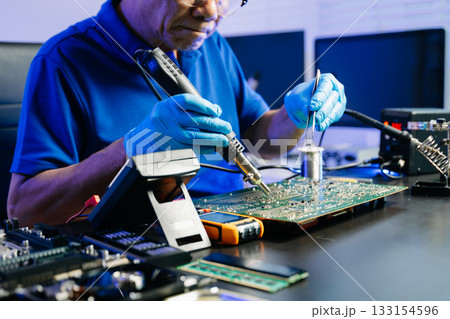 Senior technician soldering a circuit board on workbench. Blue gloves, precision tools, and electronics gear highlight