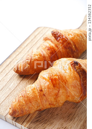 クロワッサン - 焼き立てのクロワッサンがサービングボードにのせられた朝の風景