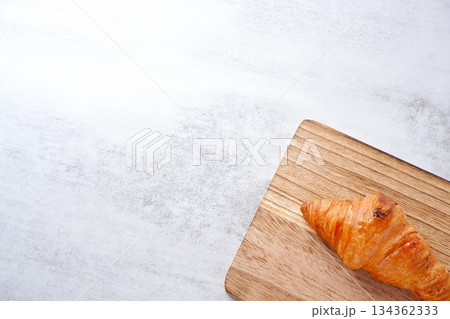 焼き立てのクロワッサンがサービングボードにのせられた、朝の風景のイメージ