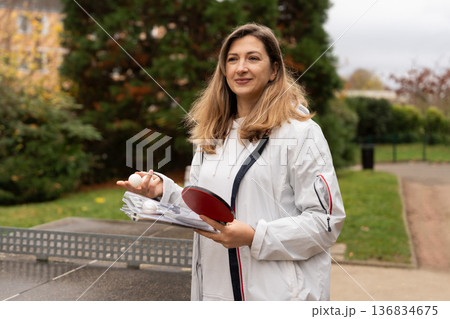 Coach woman holding clipboard and paddle racket by outdoor pingpong table