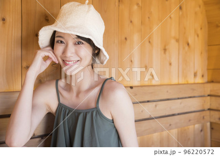サウナに入っているサウナハットを被った若いアジア人女性