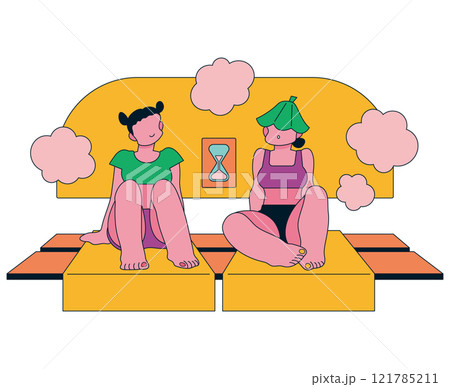 湯けむり漂うサウナ室で入浴する男性のイラスト