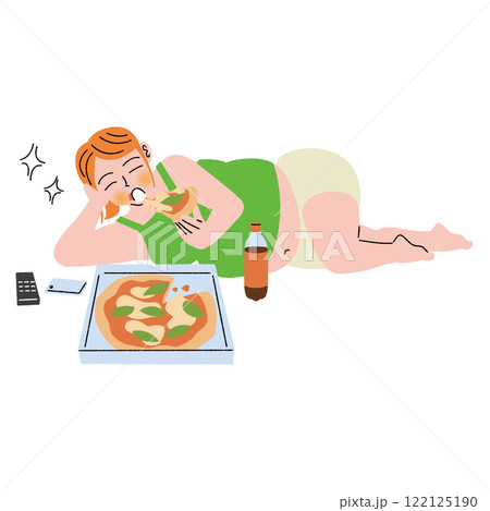 肥満の女性が横になってピザを食べる
