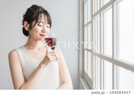 家で赤い飲み物を昼飲みするアジア人女性(赤ワイン・アセロラ・ザクロ・シソ・ポリフェノール・タンニン)