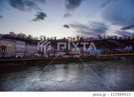 オーストリア ザルツブルグ ザルツァッハ川を挟んで夕暮れの近代美術館など