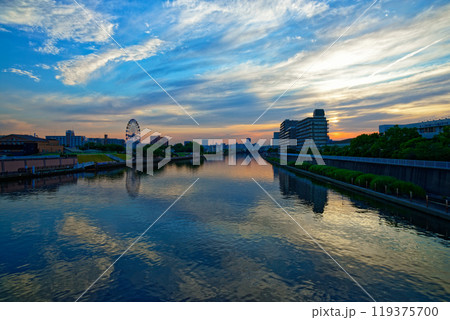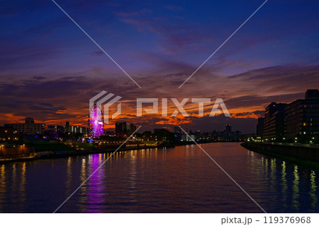 あらかわ遊園の観覧車と隅田川に映える景観 夕景 夕焼け