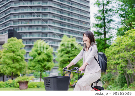 シェアサイクルで通勤をするビジネスウーマン