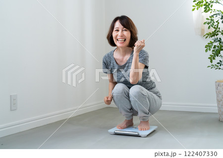 体重計を量って喜ぶ女性