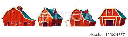 Red wooden barn isolated on white background. Farm warehouse with big door and windows. Front view. Vector cartoon illustration