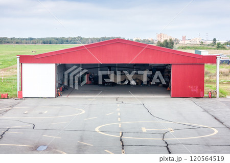 Red wooden shed with garage in the field. Vector illustration on white background.