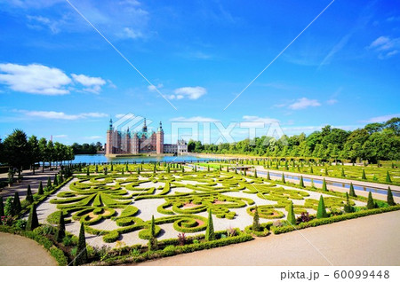 北欧のデンマーク王国 コペンハーゲン近郊ヒレレズのパラス湖畔の花越しのフレデリクスボー城と水鏡