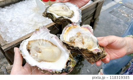Eating oysters at a street food market.