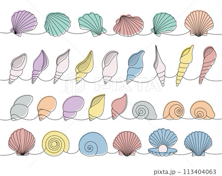Scallop sea shells set. Sea shells, mollusks, scallop, pearls. Tropical underwater shells continuous one line illustration.