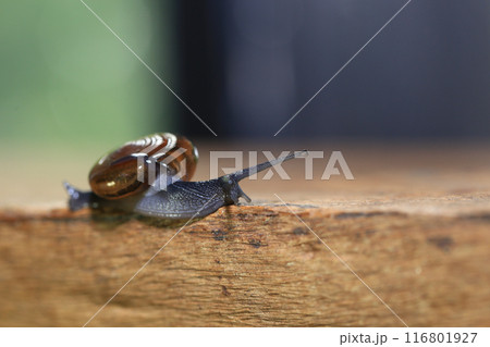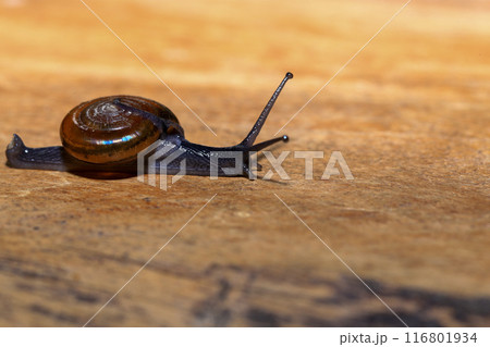 Snail crawling on the wooden floor. Close-up. Shallow depth of field.