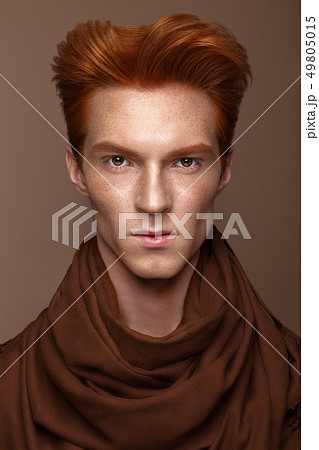 Young man with red hair and creative make up and hair.