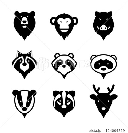 野生動物注意マーク・地図用ピンアイコンのセット・白黒