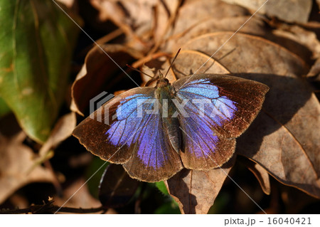 生き物 昆虫 ムラサキツバメ、メスです。前翅中央に美しい瑠璃色。天敵を遠ざける効果がある?