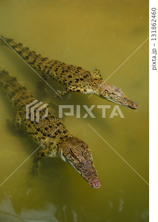 Three crocodiles swimming in murky water near a riverbank during daylight hours in a natural habitat environment