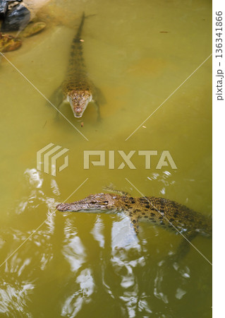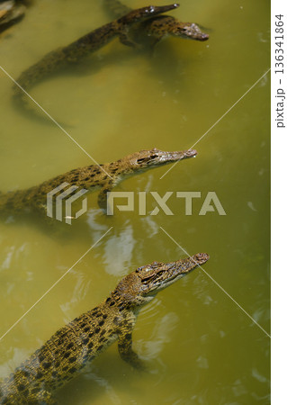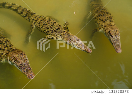 Three crocodiles swim in the water near the riverbank during the daytime in their natural habitat