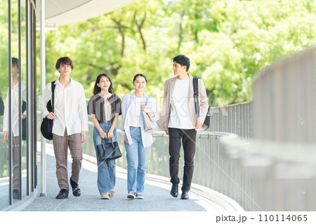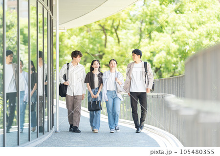キャンパスを歩く多国籍の学生グループ
