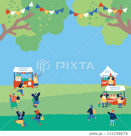 新緑のマーケットを楽しむ人々のフラットでシンプルなイラスト