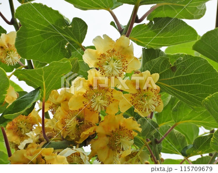 満開のキウイの黄色い花