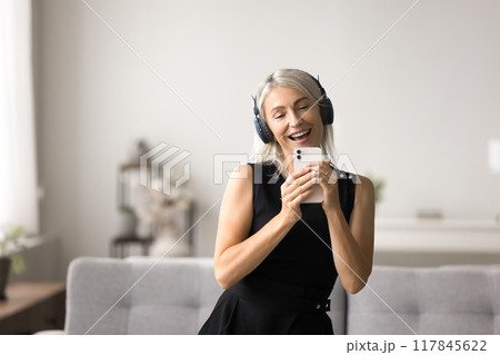 Joyful mature woman wear headphones holds smartphone and singing