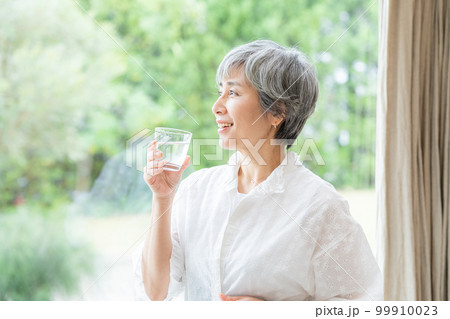 グラスで水を飲む高齢女性 健康 熱中症