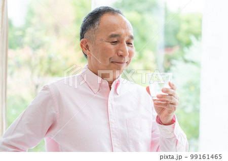 コップを持つシニア男性