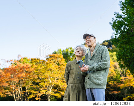 記念日の旅行を楽しむシニア夫婦(結婚記念日)