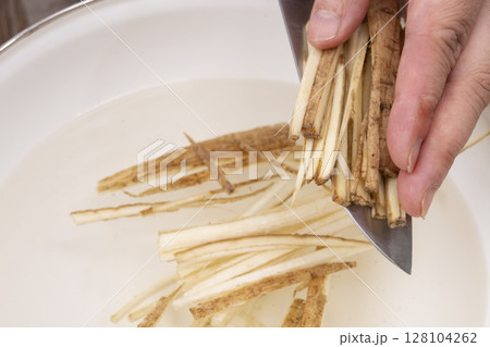 キッチンできんぴらごぼうを作る工程 ごぼうを水にさらしてアクを抜く